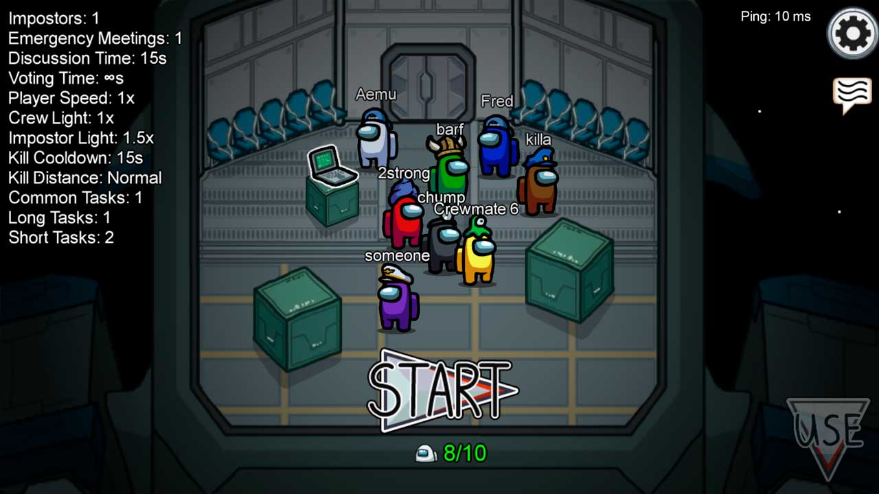 La jugabilidad no es nada del otro mundo. Te moverás con los botones WASD, para interactuar utiliza «E» y «Espacio». Si eres el asesino, apreta «Q» para eliminar a otro jugador. Con el mouse, interactuas con el menú y algunos mini-juegos dentro de la nave. También podrás configurar para usar solo mouse.