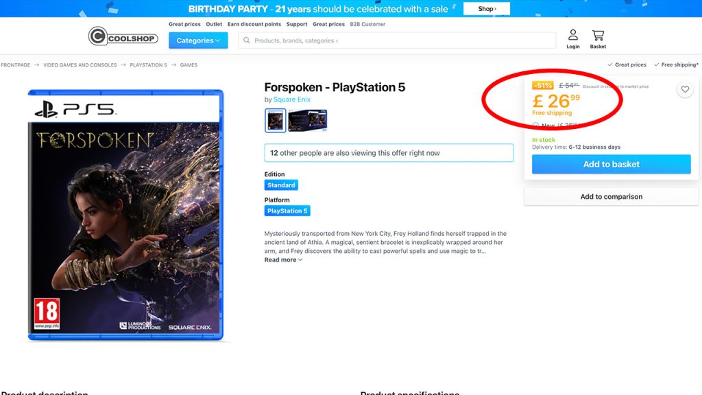 El dato llega por medio de la web de la tienda retail denominada «Coolshop». En ella podemos ver que uno de los juegos que pone en oferta es Forspoken, un juego que no ha logrado una calidad recepción entre la comunidad de gamers.