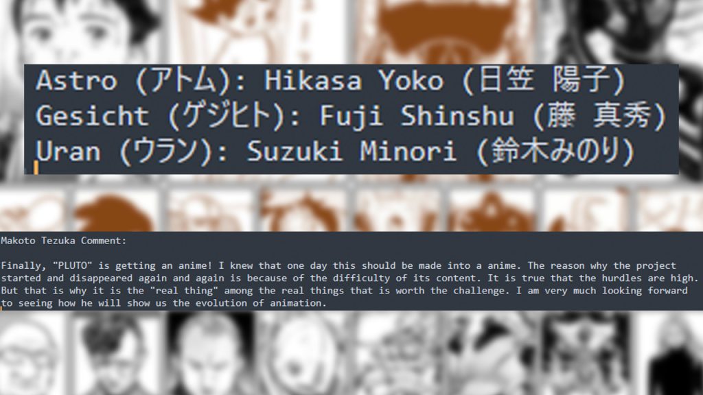 Recordemos que lo primero que supimos acerca del proyecto del anime de Pluto fue en 2017, en el espacio asignado a la productora Genco dentro del Festival Internacional de Cine de Animación de Annecy. Fue ahí donde pudimos echarle un primer vistazo a la apariencia de los protagonistas de esta historia: Gesicht, Atom y Uran.