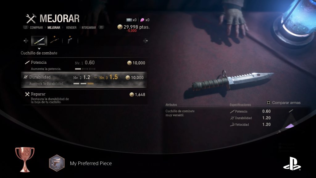 Hablando de esta arma, cobra mucha más importancia en el remake. Además de atacar, ahora también podemos bloquear ataques con el cuchillo, incluso los de minijefes y algunos jefes. Es por ello que tendrá una barra de uso que irá disminuyendo mientras más lo utilicemos. Incluso se podrá romper y tendremos que acudir al buhonero para repararlo.