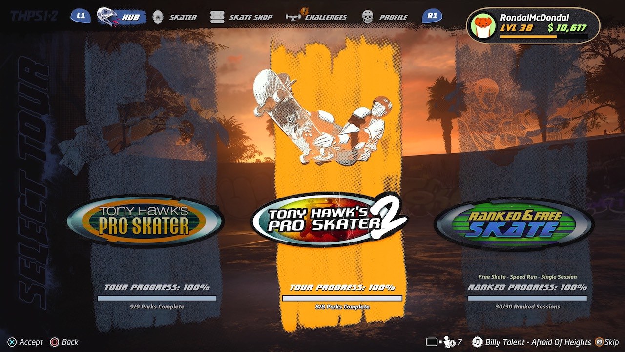 Similar a otras remasterizaciones de Activision, tendremos acceso a la campaña de ambos juegos de Pro Skater desde el comienzo. Cada uno está lleno de metas por cumplir como obtener un puntaje alto, destrozar varios objetos, encontrar ciertos gaps o encontrar el VHS secreto. Deberás completar una buena cantidad para progresar la campaña, algo muy sencillo para cualquier veterano puesto que todo está en su lugar. Es más, agregaron más retos en los niveles del primer Tony Hawk para que no carezca en comparación a su secuela. Algo inteligente que hizo Vicarious Visions es dividir los coleccionables que suben tus stats entre los niveles de ambas campañas, conectándolas entre sí y facilitando las cosas al ir de una en otra.