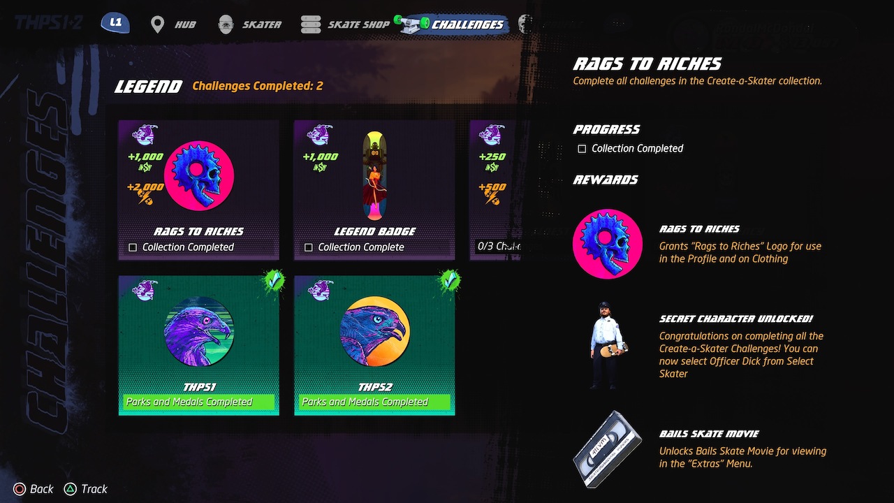 Afortunadamente cada reto está muy bien catalogado en el menú, incitándote a completarlos para subir tu nivel, obtener skins para los pros, recibir nuevas tablas de skate y desbloquear secretos como personajes ocultos. Más importante, obtendrás dinero que podrás invertir en ropa para tu personaje creado y objetos para el creador de parques. Eso sí, muchos solo podrán ser obtenidos como recompensas de retos y algunos ni siquiera podrás adquirirlos hasta que llegues a cierto nivel, así que demuestra lo que tienes en la calle.