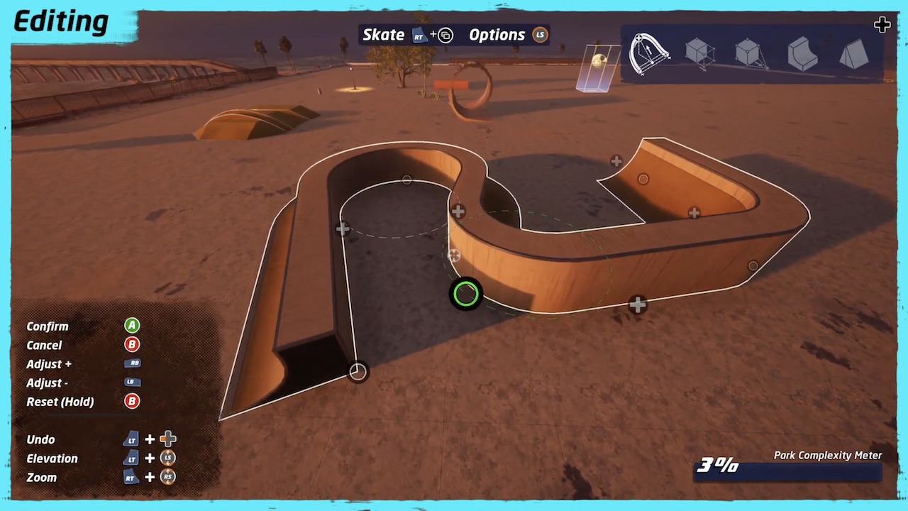 Y sí, finalmente regresa el Creador de Personajes. No es tan bueno como sus contrapartes de PS2 o lo visto en Soulcalibur, pero es mucho más que servicial. Además de la ropa y cambios estéticos como el peinado, puedes elegir su estilo de skating y la posición en la que patinan. Aunque debes estar muy seguros de las opciones que afectan al gameplay pues no se pueden cambiar después. Eso sí, siento que las opciones de caras están muy limitadas. Solo puedes elegir entre unas cuantas y ni puedes modificarlas. Aún peor, las que te ofrecen no son la gran cosa, especialmente en el lado femenino.