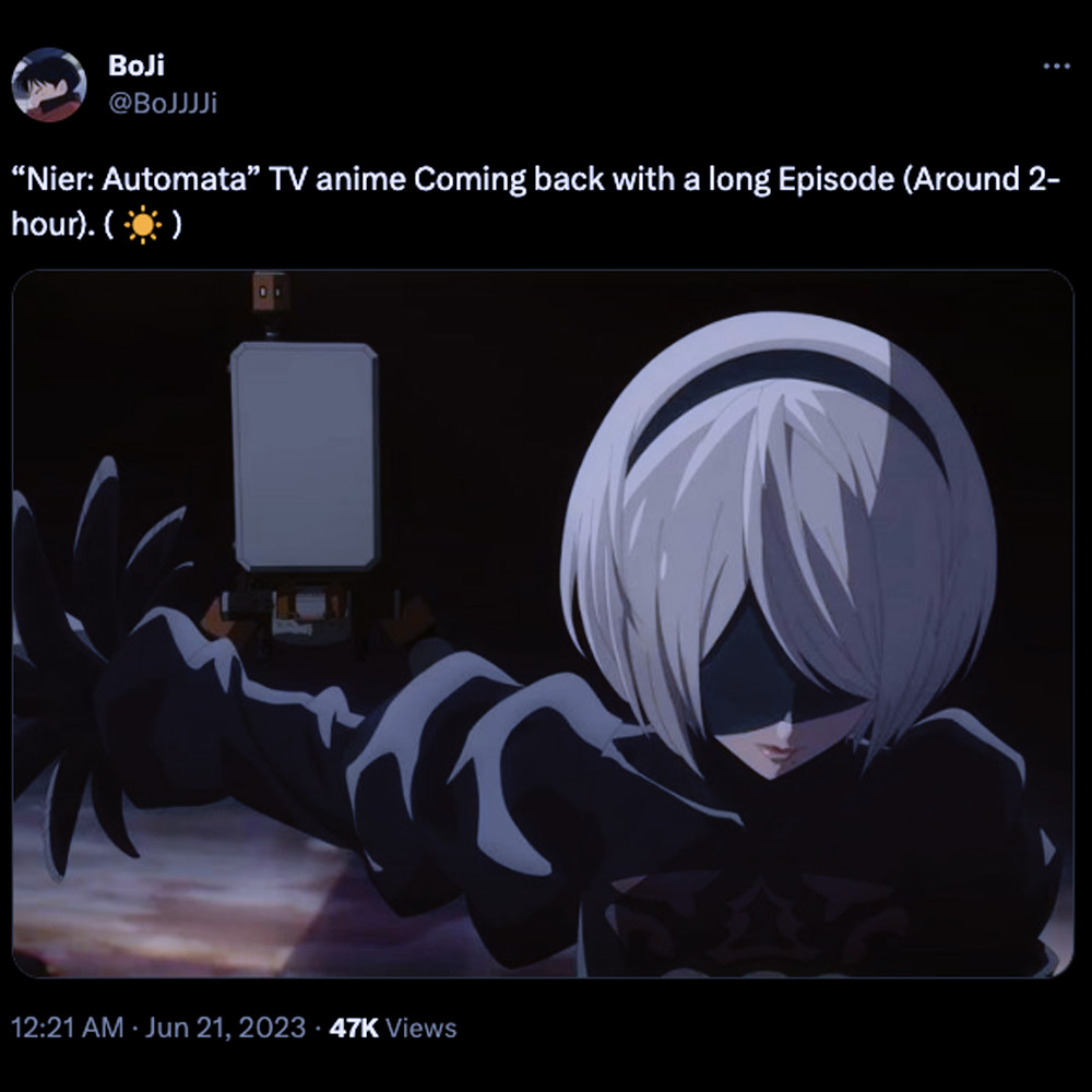 De todos modos hasta el momento la cuenta oficial del anime de NieR:Automata aún no se ha pronunciado al respecto a través de sus canales oficiales. Así que de todos modos hay que mantener el hype bajo control.