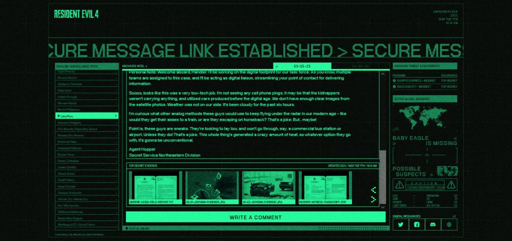 babyeagleismissing.com es la web desde donde podremos jugar este juego de realidad aumentada, que sirve como una precuela a los eventos de Resident Evil 4. Para no caer en los spoilers solo diremos que trata de resolver el misterio tras la desaparición de Ashely Graham, quien recibe el nombre en clave «Baby Eagle».